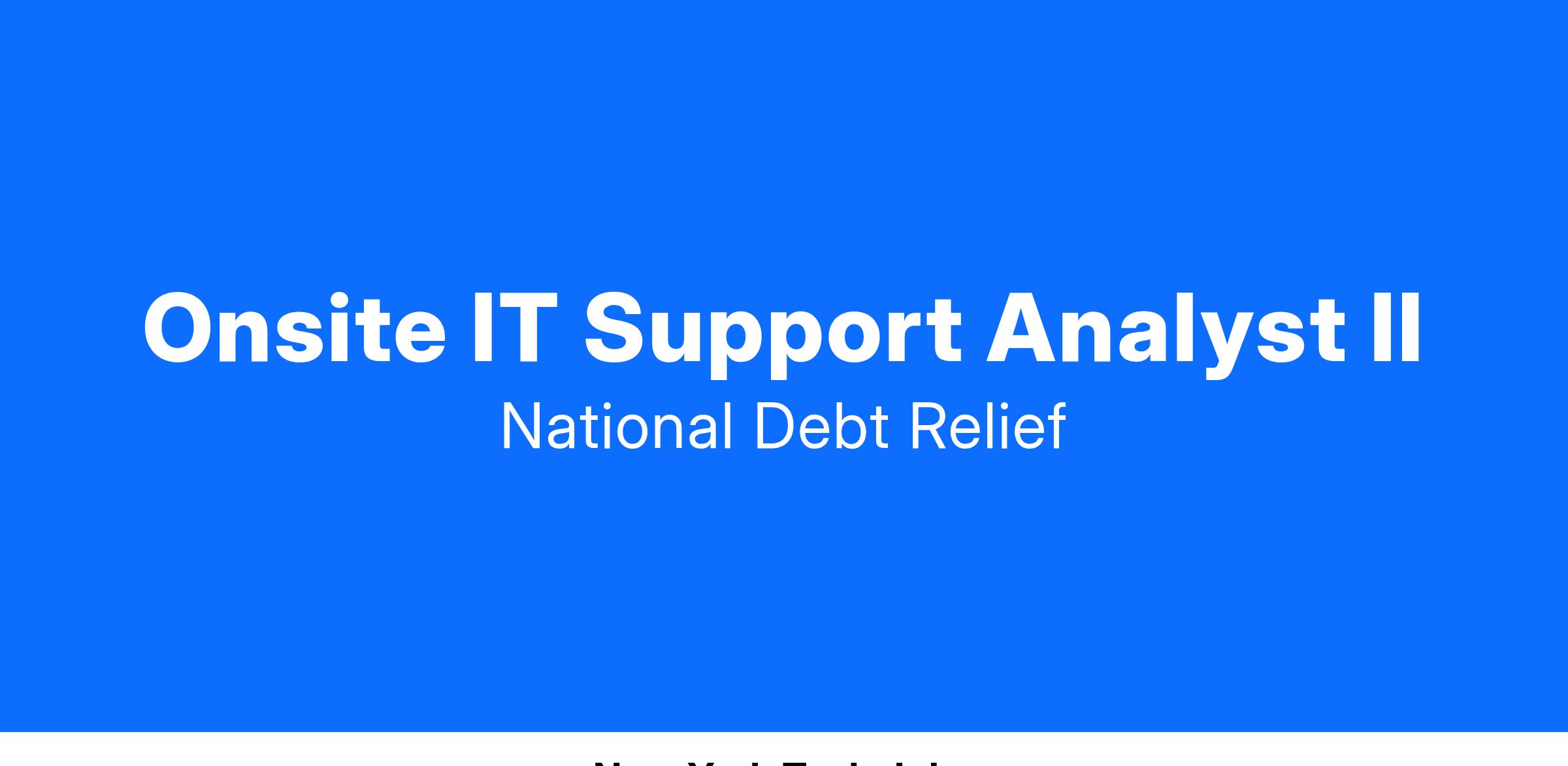 National Debt Relief is seeking an Onsite IT Support Analyst II to join our growing technology team. Reporting to the IT Support Manager, the primary role is end-user support, advance troubleshooting, and support of L1/2 end user issues to the highest levels of customer service. The Onsite IT Support Analyst II will be the onsite and remote escalation point of contact for the IT Support Analyst L1 to enable a higher level of support for National Debt Relief’s Organizations and BPOs end-user population supporting the staff on a variety of technology issues. The candidate must be team-oriented, customer service driven, and have the ability to work under pressure with minor supervision. The Specialist will support and assist subsidiaries and affiliated companies.