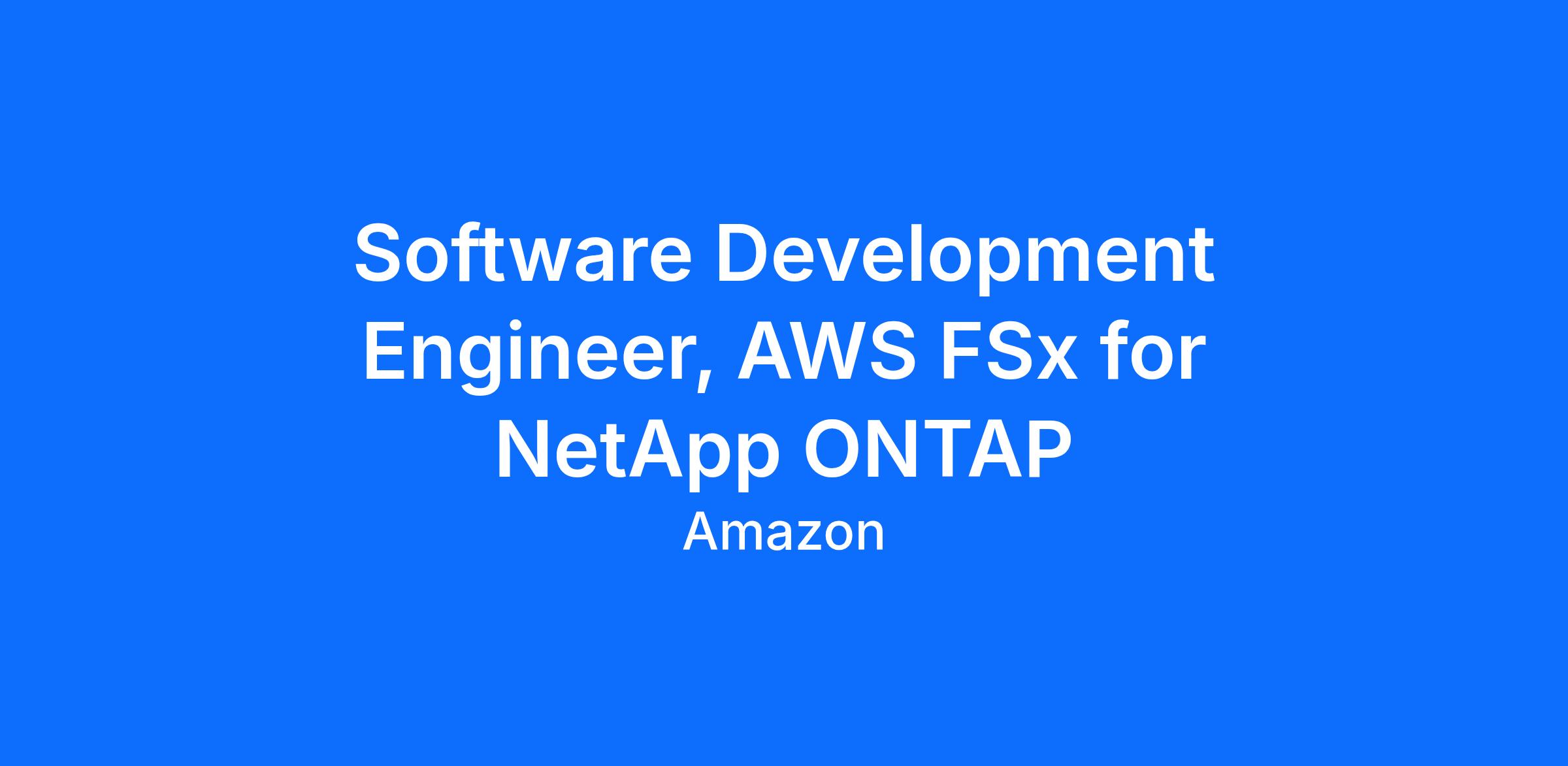 We are looking for a Software Development Engineer to join the Amazon FSx for NetApp ONTAP team. Launched at Re:Invent in November 2021, Amazon FSx for NetApp ONTAP is a fast-growing AWS service that makes it easy for customers to launch and run fully managed NetApp ONTAP file systems in the cloud. With Amazon FSx for NetApp ONTAP, in just minutes you can provision a high-performance, feature-rich file system that delivers multi-protocol access (NFS, SMB, and iSCSI), built-in data compression and deduplication, seamless snapshots and replication, and sub-millisecond latencies. Customers already love the service for migrating and running their enterprise workloads in the cloud, but we're just getting started. Come join the Amazon Web Services engineering team as we revolutionize the world of enterprise storage and hybrid cloud!